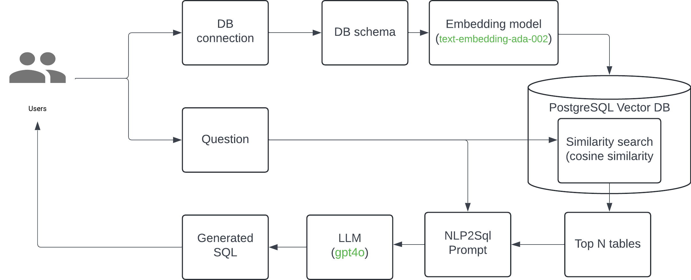 The system begins with users inputting natural language queries, which are then processed to retrieve the relevant database schema via a direct connection. This schema is embedded using the text-embedding-ada-002 model, and the resulting vector representations are stored in a PostgreSQL Vector DB.