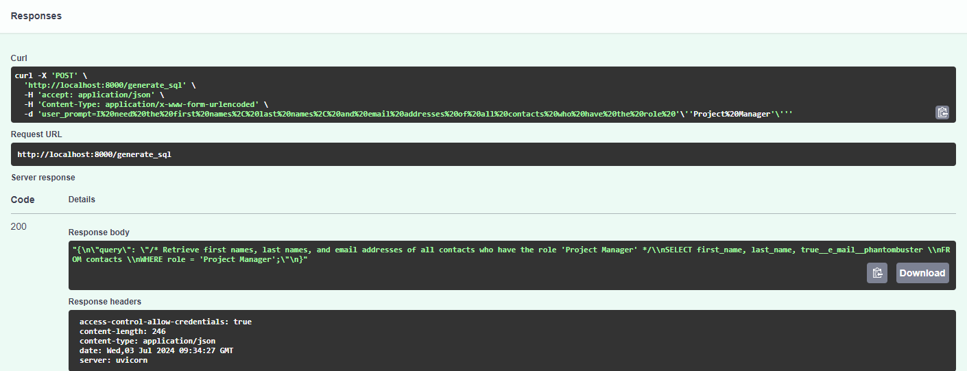 Leveraging the latest advancements in natural language processing and machine learning, particularly GPT-4о, we developed a system that not only generates accurate SQL queries but also provides a user-friendly interface through Swagger UI. Key system features and capabilities include: