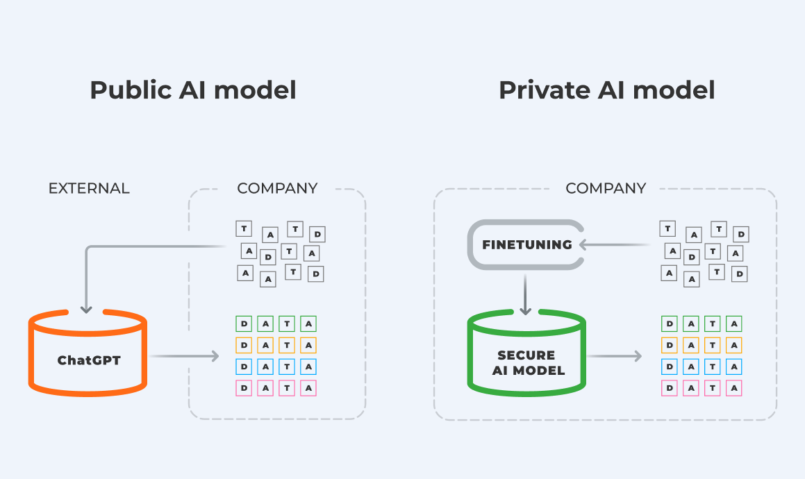 Keeping in mind the intention of people to use a tool like ChatGPT in their business and their data privacy concern, our R&D team has figured out the way out, which lies in deploying a private LLM. The point is, if you launch your own GPT (LLM) model locally in your infrastructure, data never goes outside and stays safe within the company.