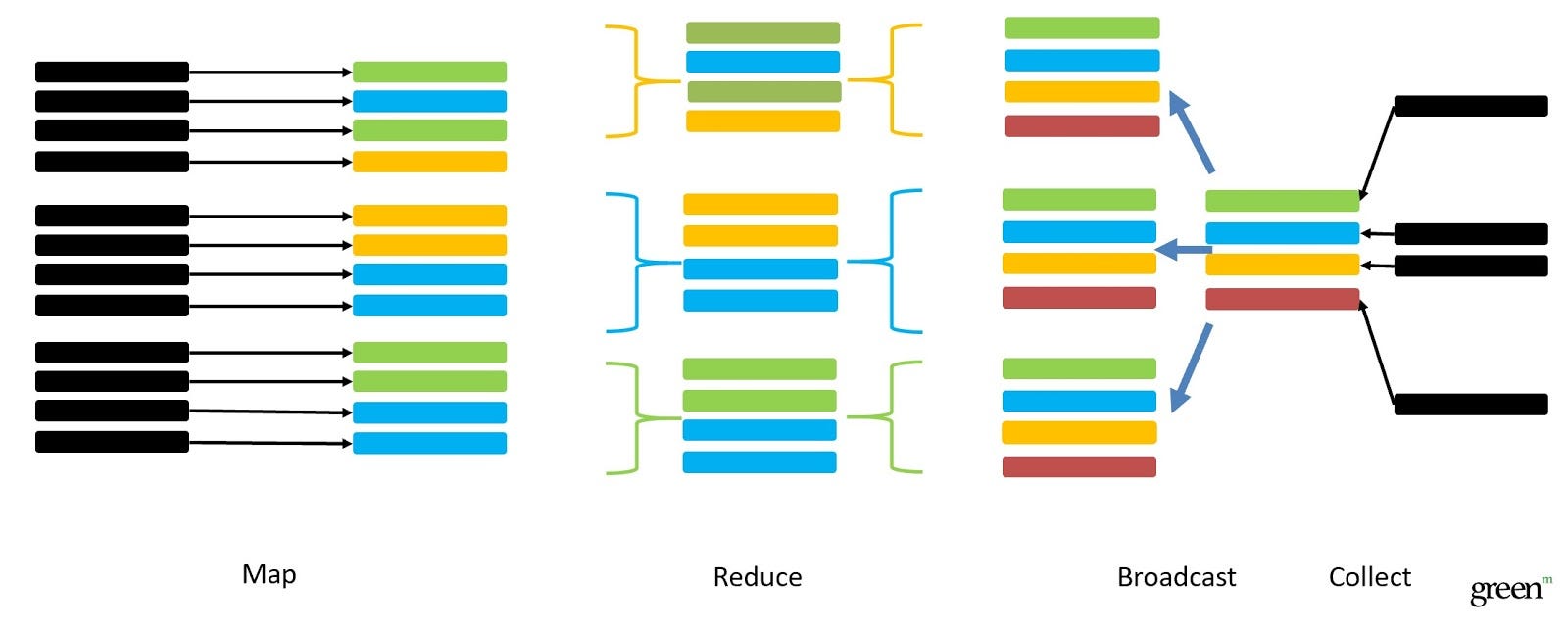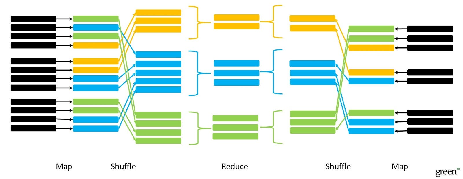 Your data are divided into groups and distributed throughout the cluster in a way that a single key appears on the same node. That’s how joining occurs. This complex operation is called shuffle, and if you have an abundance of data, most of all the processing time will be spent on shuffles.