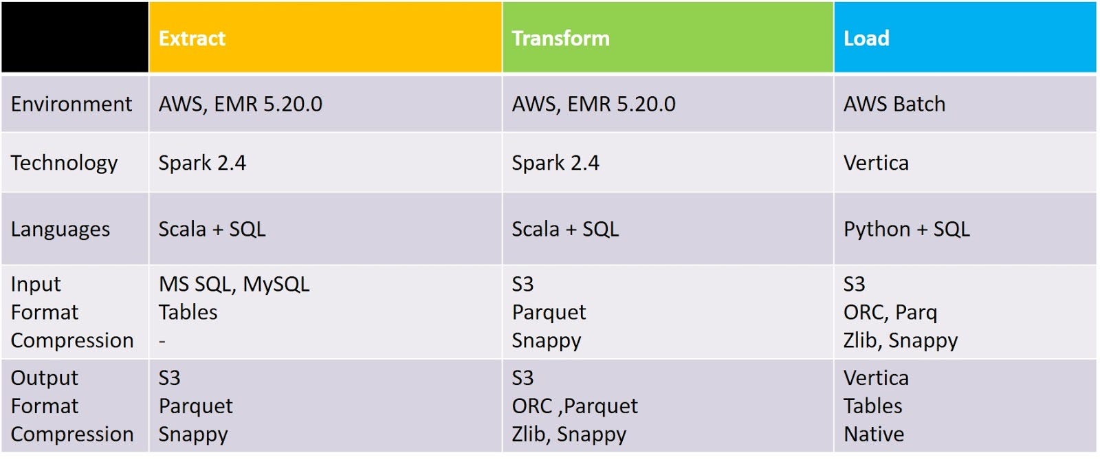 The last stage in our data pipeline processing is load. We don’t use any special load processes and programs. Instead, we make a request with listed files (you can separate them by commas or just specify a mask). Then, Vertica on its own goes to S3, takes the list of files and distributes them between nodes.