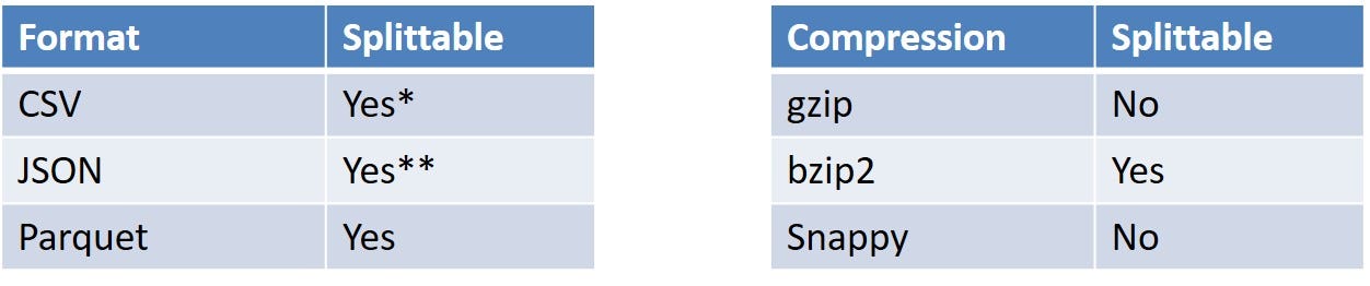 * CSV is splittable when it is a raw, uncompressed file or using a splittable compression format such as BZIP2